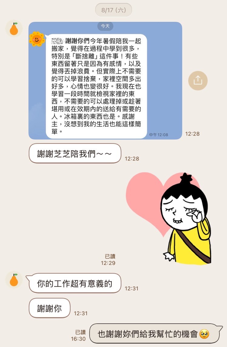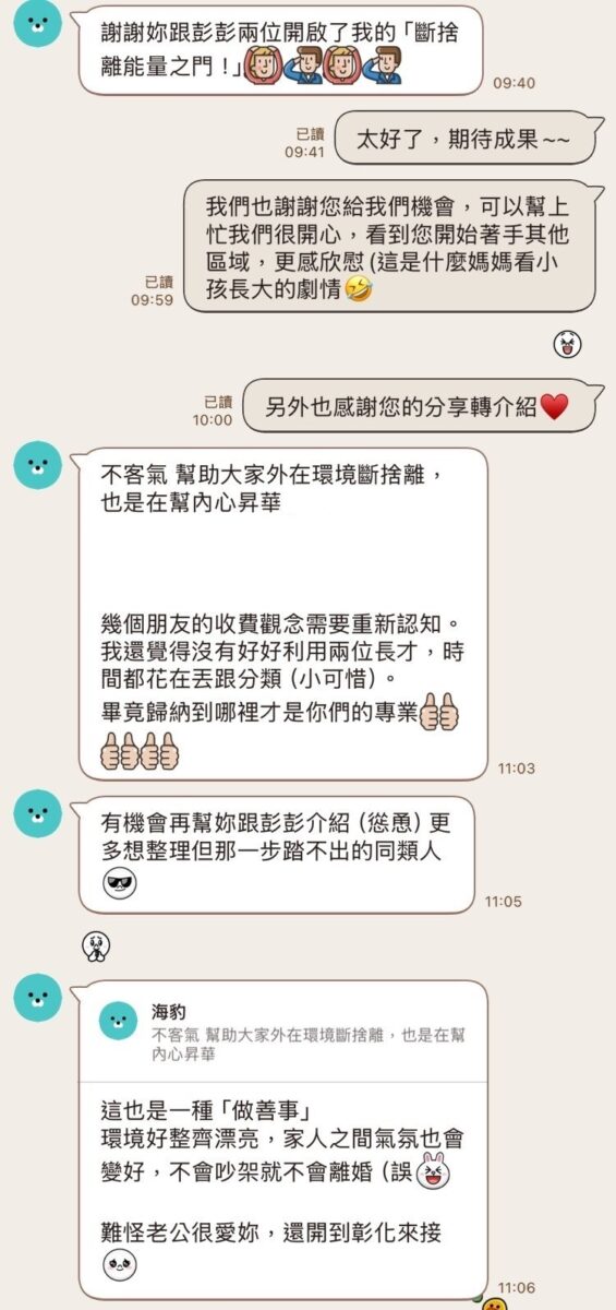 我們的整理師善待每個空間、每個物品, 像對待自己的家一樣不會不明不白的丟了你的寶貝,用心待物,他們也會用心待你